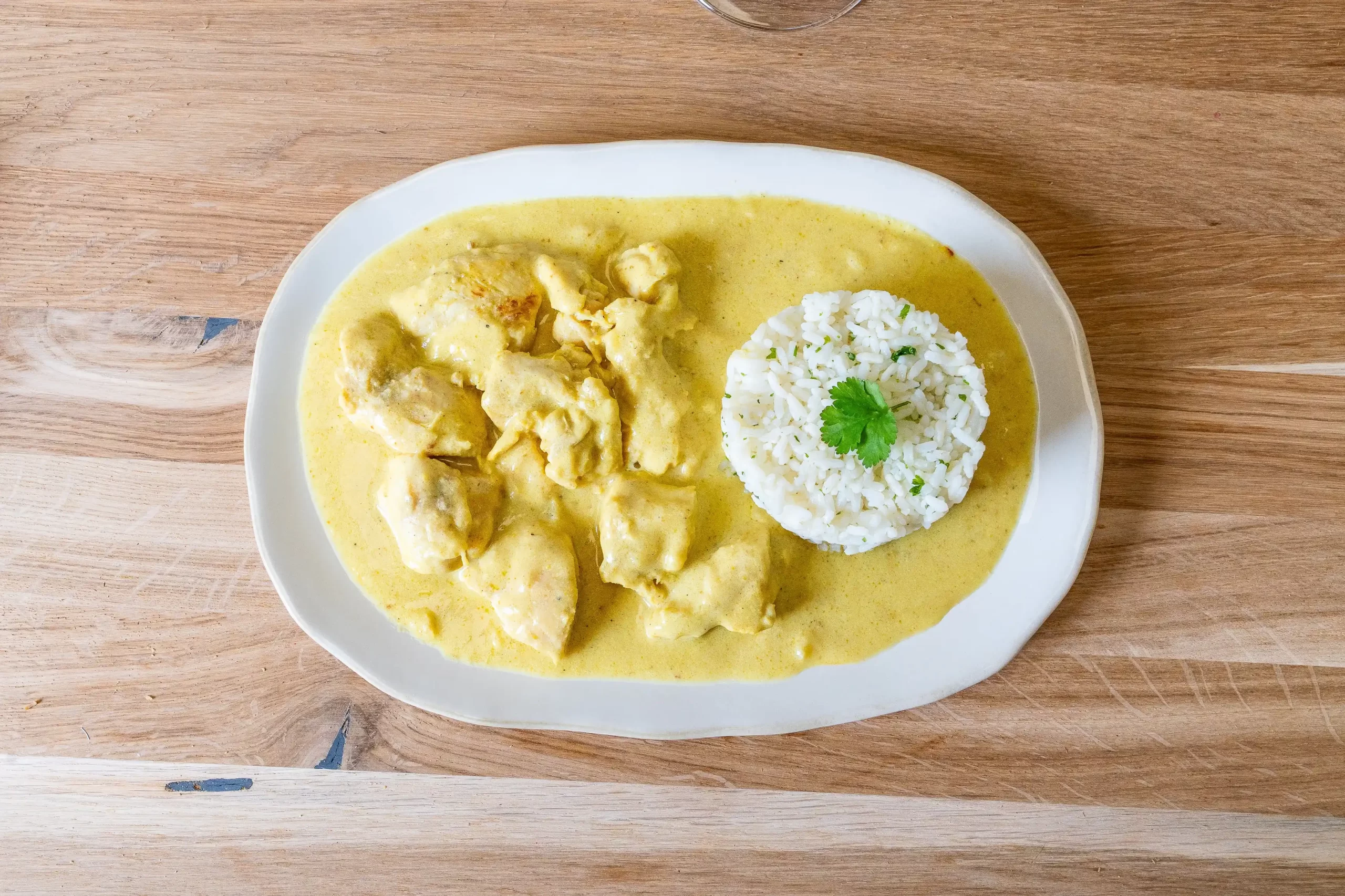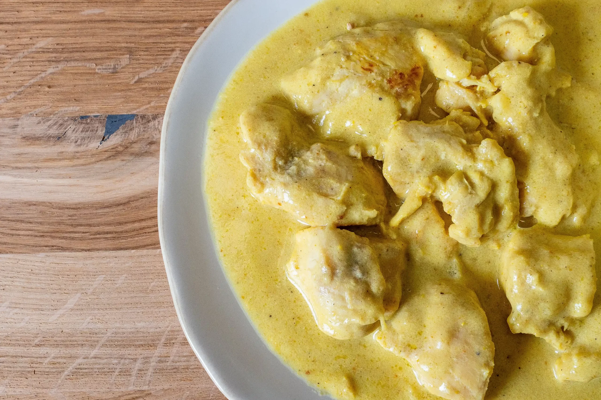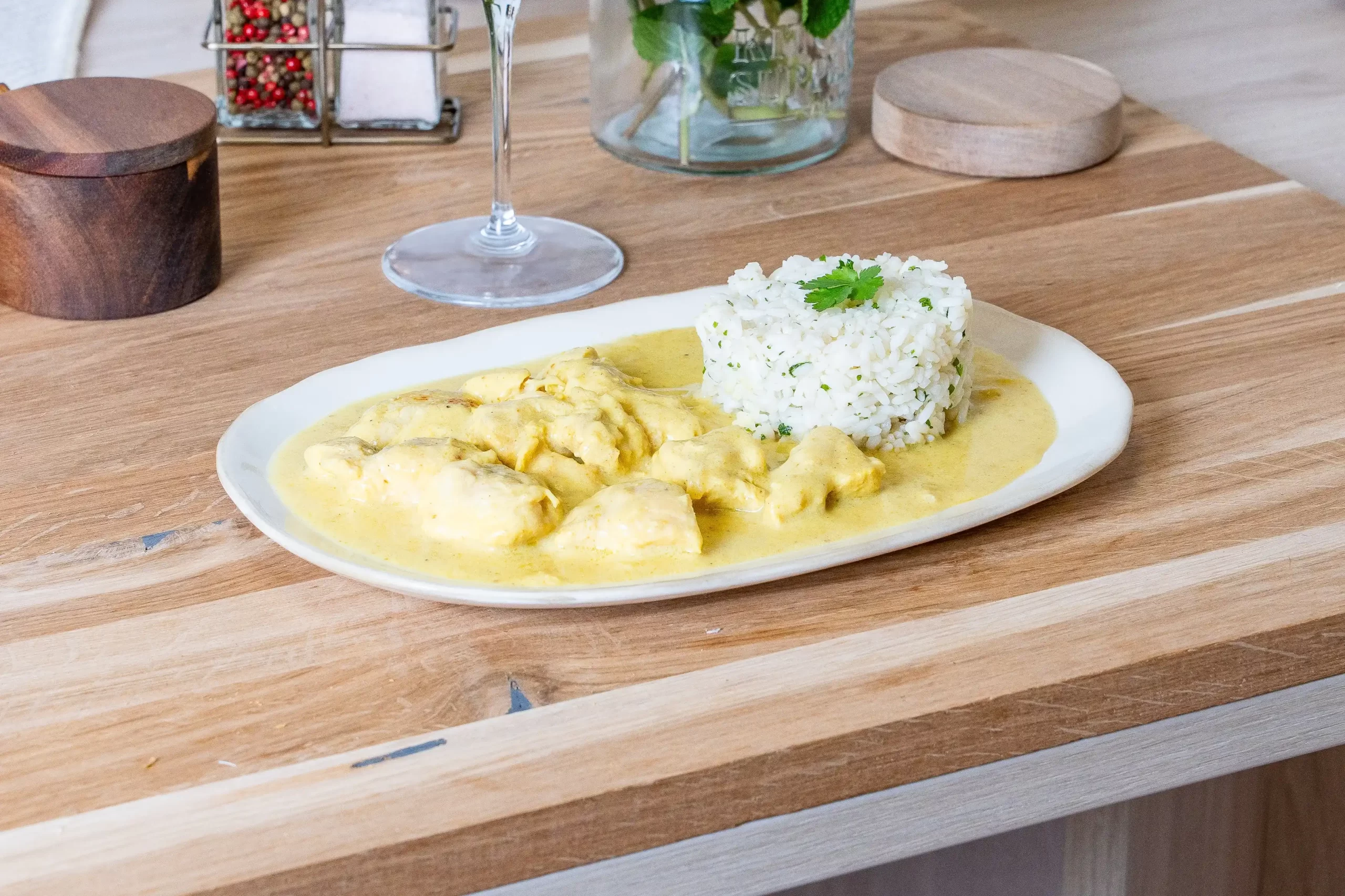 Nuestro pollo al curry combina la suavidad del pollo con una salsa cremosa y aromática, cocinada lentamente con AOVE ecológico Esencia Familiar, leche y una mezcla equilibrada de especias naturales.
