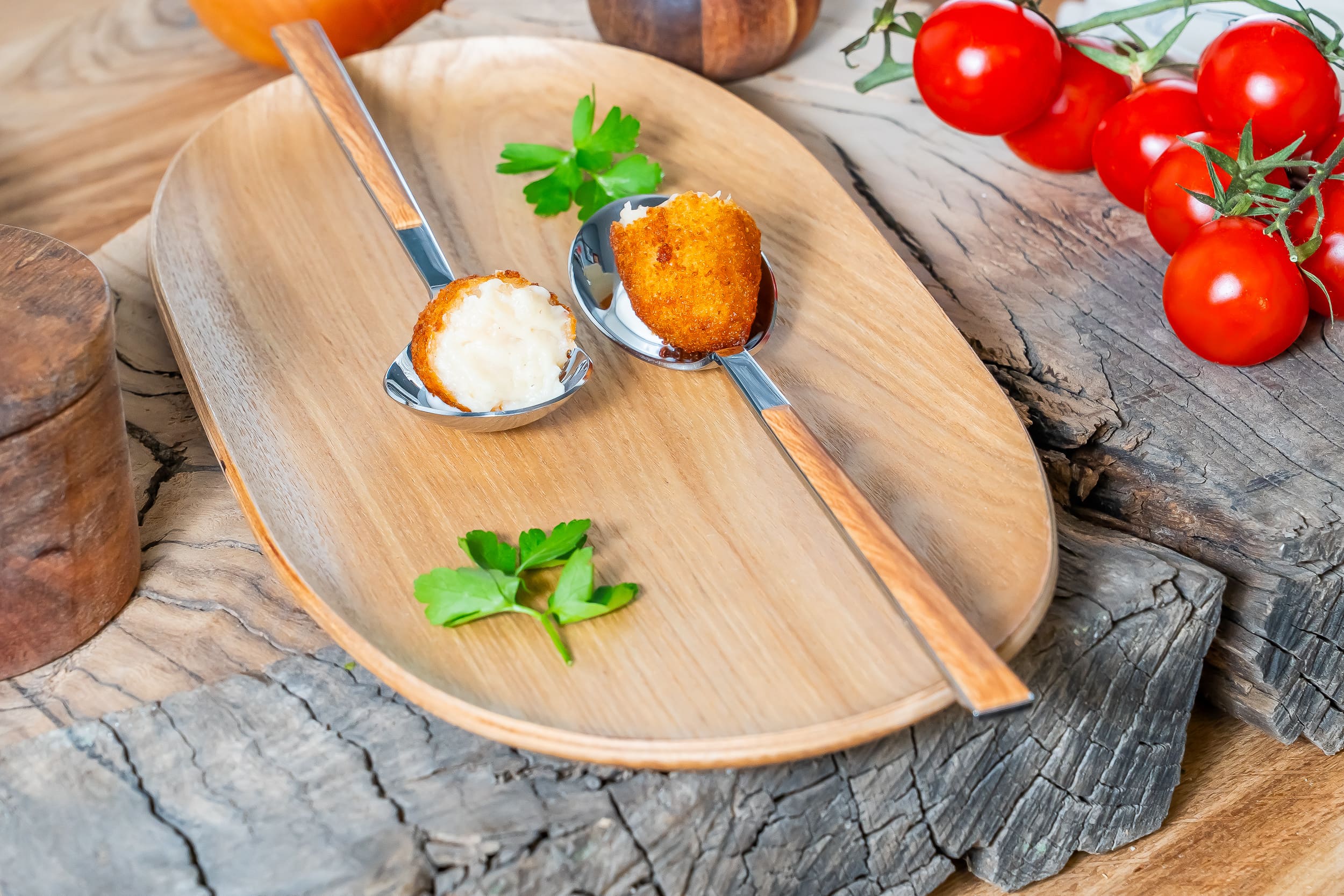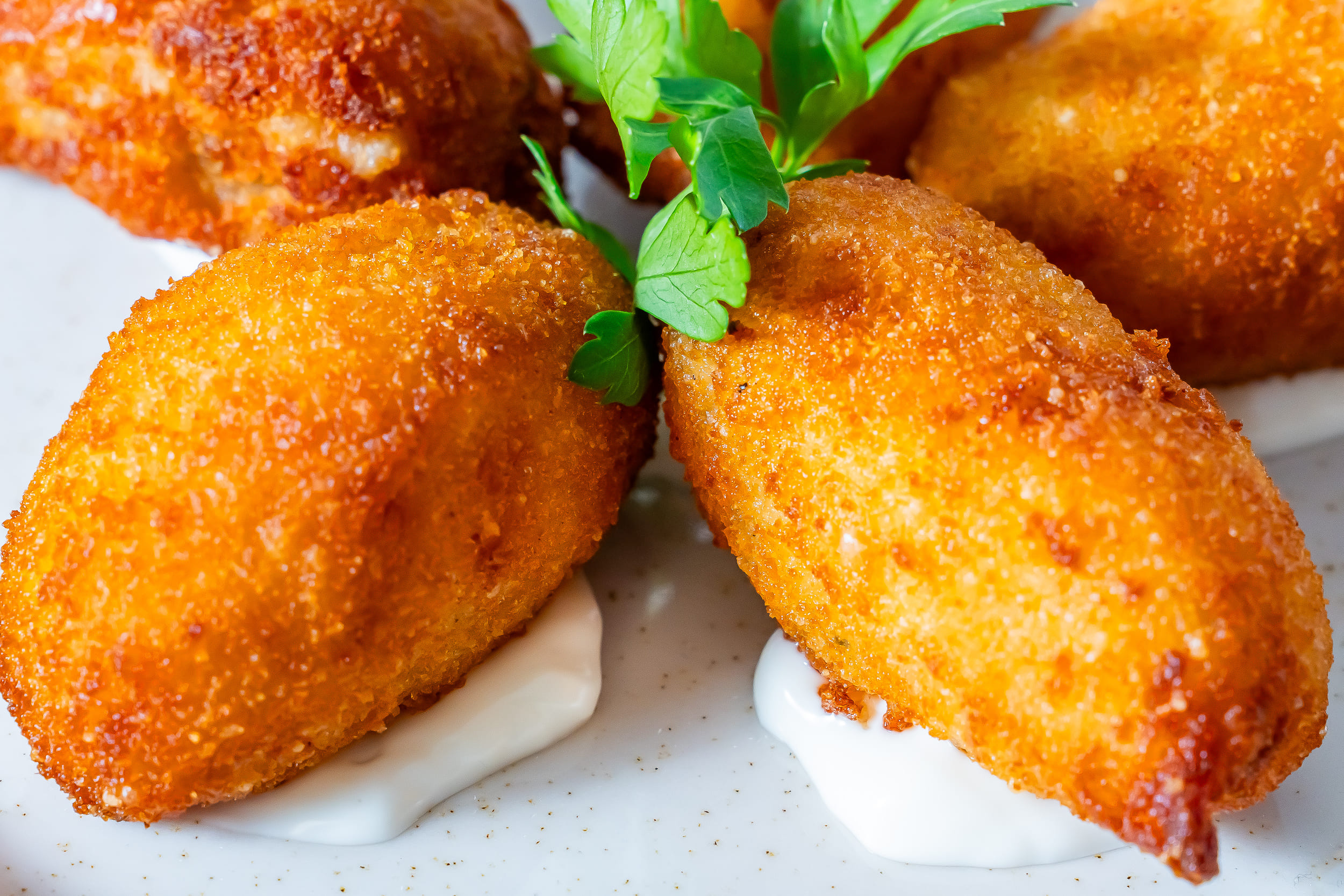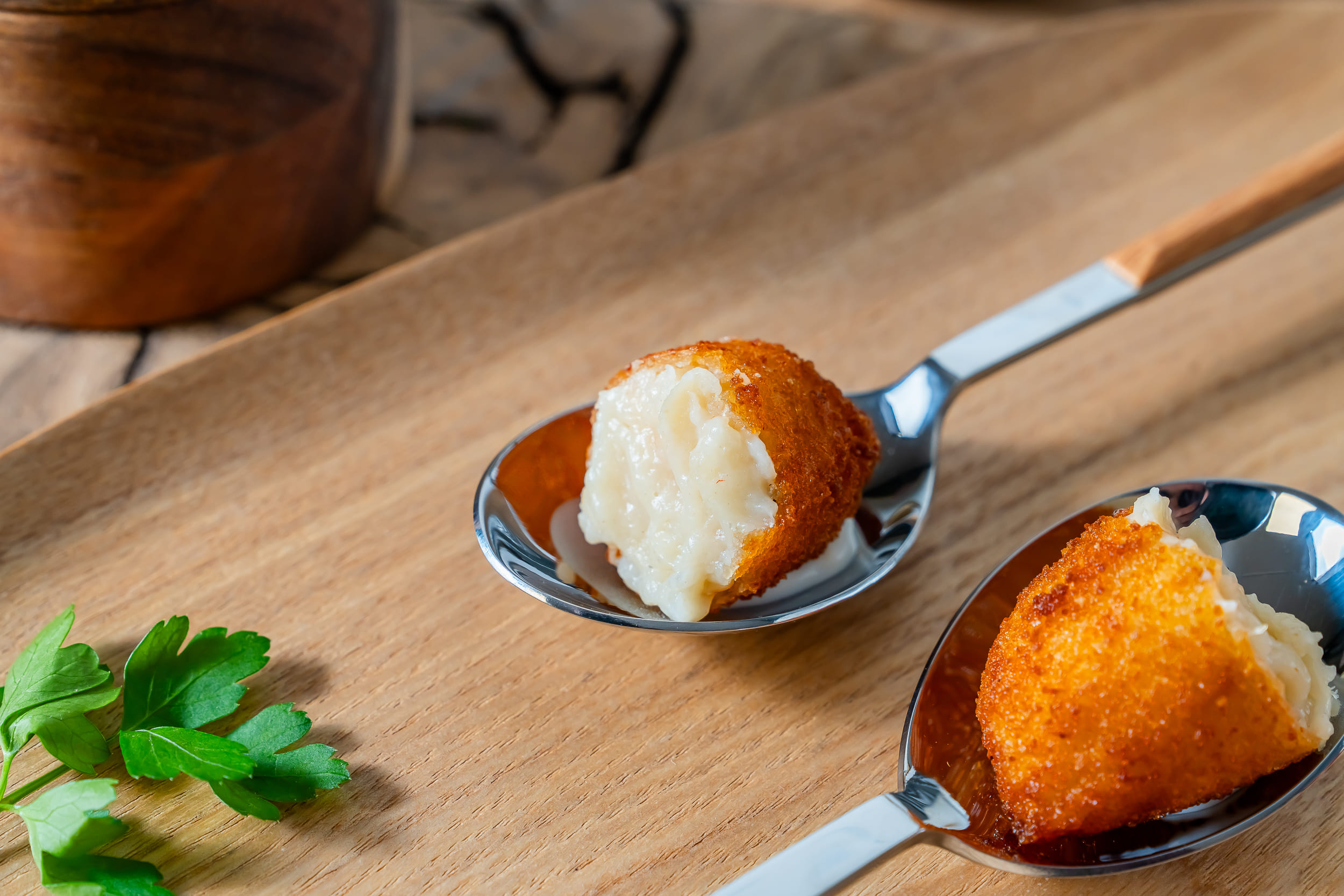 Nuestras croquetas de bacalao equilibran la intensidad delicada del pescado con una bechamel fina y envolvente. El resultado es un interior cremoso, ligeramente salino y lleno de matices, protegido por un empanado dorado y crujiente.