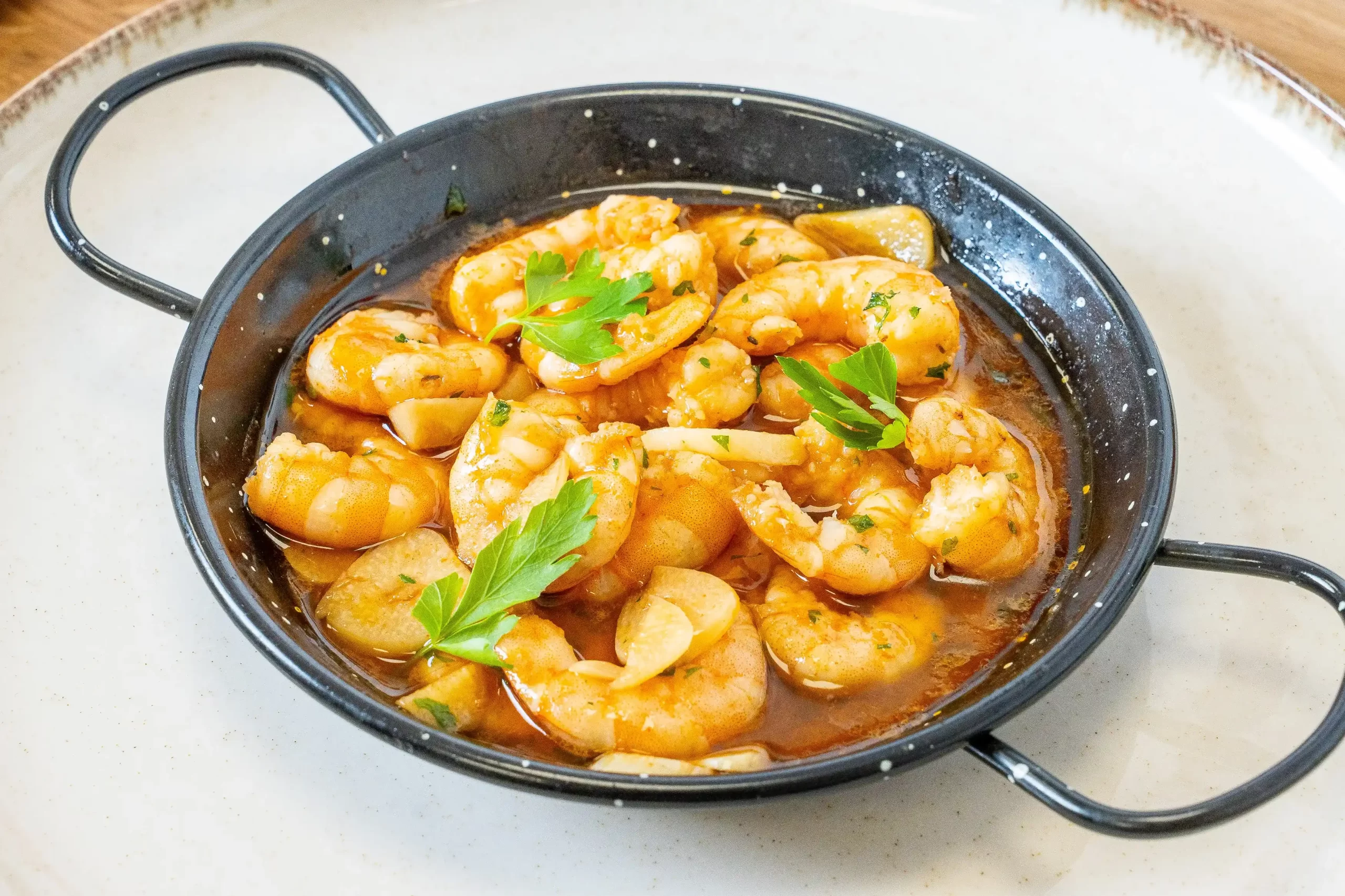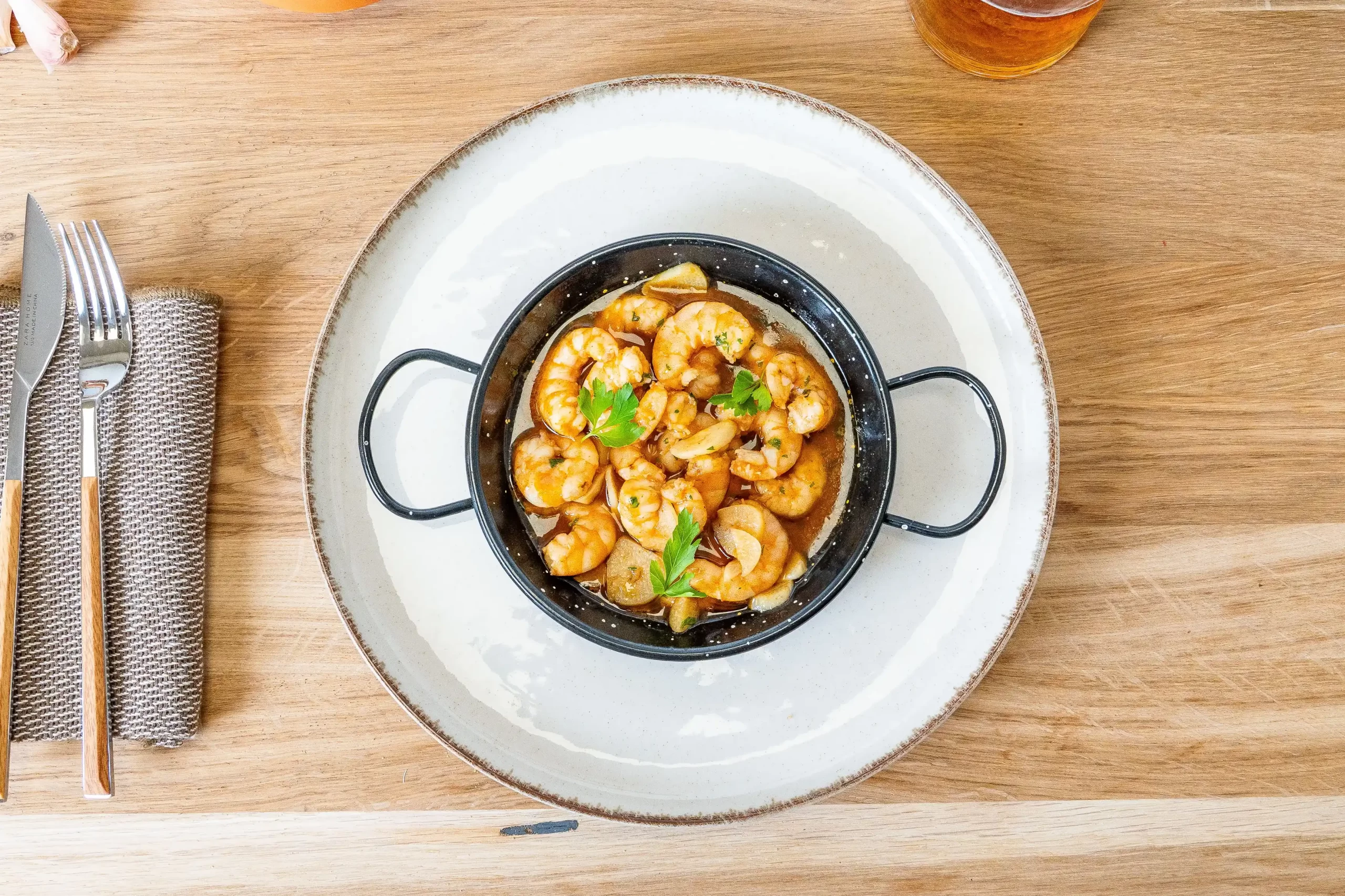 Una receta clásica de la cocina mediterránea, preparada con langostinos frescos, ajo laminado y un toque justo de guindilla, salteados en nuestro aceite de oliva virgen extra ecológico.